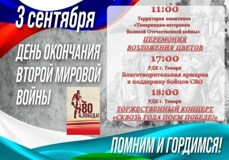 3 сентября в Южно-Сахалинске в 09:00 на Мемориале Славы начнётся церемония возложения цветов и гирлянд к Вечному огню, а также торжественное шествие. В памятных мероприятиях примут участие представители органов власти, духовенства, военнослужащие, а также жители и гости города. Далее в 10:00 на площади Победы состоится военный парад, почётными зрителями которого будут ветераны Великой Отечественной войны, среди них участники Южно-Сахалинской наступательной операции в августе 1945 года — Гаврилов Вячеслав Васильевич и Андреев Василий Николаевич.