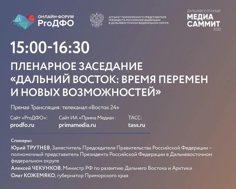 Возросшую роль и место дальневосточного региона в современных политических и экономических условиях обсудят во Владивостоке пленарном заседании форума «ProДФО- Владивосток». Дискуссия «Дальний Восток: время перемен и новых возможностей» пройдёт в рамках Дальневосточного Медиасаммита-2022, который стартует в столице Приморья 9 июня.