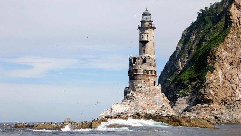 Маяк Анива расположен в заливе Анива на крайней южной точке. Маяк был установлен японцами в 1939 году на небольшой скале Сивучья, возле труднодоступного скалистого мыса Анива. Высота маяка составляет 31 метр, а высота света над уровнем моря – 40 метров. Башня состоит из 9 этажей.